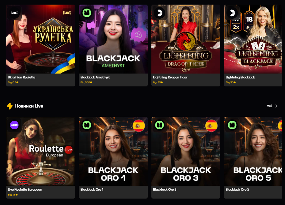 Українська рулетка, Lightning Blackjack, Speed Baccarat, Wonder Wheel, Monopoly Live |